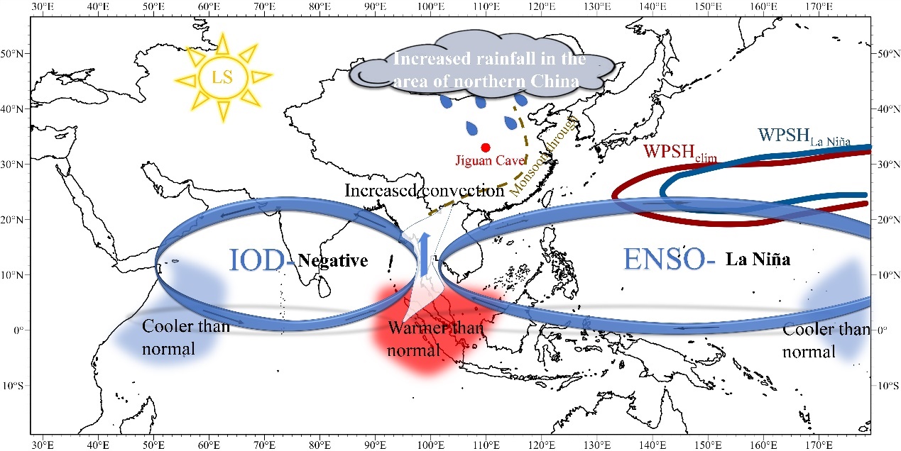 石笋氧同位素(δ18O)已广泛用于重建亚洲夏季风的变率,其变率在轨道-季节尺度上主要受到太阳辐射的控制。然而,石笋δ18O所指代的气候学意义并不清楚,太阳活动对气候的影响机制仍需进一步研究。前期,许多研究采用古气候指标统计分析来推测太阳活动对气候的影响,缺少现代高分辨率的洞穴监测结果来验证太阳活动对亚洲夏季风地区的潜在影响机制。连续的现代洞穴监测可以为解释石笋氧同位素的气候学意义提供证据,太阳活动对亚洲夏季风的影响值得进一步探究。2009年至今,杨琰教授课题组以秦岭东段伏牛山北麓鸡冠洞为研究对象,连续进行14年的监测工作,开展石笋氧碳同位素及微量元素机理的研究。研究区位于河南西部,处于长江黄河分水岭以北,湿润与半干旱气候的过渡地带,其特殊的地理位置决定了对亚洲夏季风响应比较敏感。基于大气降水、洞穴滴水和现代洞穴沉积物的δ18O的监测结果(图1),并结合鸡冠洞毗邻洞穴东石崖洞一根近200年的石笋δ18O记录,通过分析不同ENSO (El Niño Southern Oscillation)事件下的水汽环流情况和局地大气水线(LMWL),发现降水δ18O在年际-季节尺度上反映了大气的水汽环流变化。由于太阳活动是亚洲夏季风最重要的外部影响因素之一,本研究还利用交叉小波分析了太阳黑子数与亚洲夏季风之间的周期关系。发现石笋δ18O可以在十年尺度上反映太阳活动引起的局地降水变化,进一步验证太阳活动强度为主的驱动和ENSO相关的海表温度异常是影响氧同位素变化的主要因素。因此,研究推测太阳活动的变化引起了热带海表温度异常,并通过改变ENSO和印度洋偶极子(IOD)的变率影响了中国中部的水循环(图2),最终导致了石笋δ18O记录的变化。