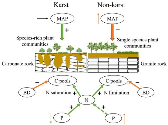 图 喀斯特与非喀斯特地区土壤固碳过程机理差异概念图