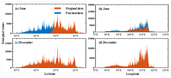 基于此,施开放副教授研究小组开发了新一代跨传感器校正1992-2019中国“类DMSP-OLS”夜间灯光遥感数据集。该研究利用“伪不变像素”方法对DMSP-OLS数据进行校准,并且考虑到DMSP-OLS数据与SNPP-VIIRS数据时间分辨率的一致性,在合成年度SNPP-VIIRS数据之前实现SNPP-VIIRS原始月度数据中缺失数据的修复。此后,该研究进一步结合校准DMSP-OLS数据 (1992-2013年) 和由SNPP-VIIRS数据转换的类DMSP-OLS数据 (2013-2019年) 计算得到改进的类DMSP-OLS数据集 (1992-2019年)。为了验证数据的准确性,采用定性分析和定量分析进行比较评估。评价结果表明,通过选择不变像素而不是城市作为校准点校准DMSP-OLS数据可以有效提高不同年份与不同传感器之间DMSP-OLS数据的连续性。此外,利用SNPP-VIIRS月度修复数据合成的SNPP-VIIRS年度数据与2015年和2016年官方年度SNPP-VIIRS数据的相关性 (R2) 分别达到0.931和0.930,而通过剔除缺失数据以及权重法合成的两组SNPP-VIIRS数据与官方年度数据的相关性均低于0.90。通过直方图、散点图、剖面线等空间格局相似性分析对比发现,2013年类DMSP-OLS数据与2013年DMSP-OLS数据差异较小,2013-2019年类DMSP-OLS数据与2012年DMSP-OLS数据高度相关。改进的类DMSP-OLS数据总像元值和总亮值像元数的时间趋势相对一致。通过对统计数据与三类长时序夜间灯光遥感数据集进行回归分析发现,改进后的类DMSP-OLS数据优于已发布的两类长时序夜间灯光遥感数据集,并且在国家和省级尺度上的平均R2分别为0.931和0.654。以上研究表明,改进的类DMSP-OLS数据集在评价与分析社会经济发展和人类活动方面具有巨大的潜力。