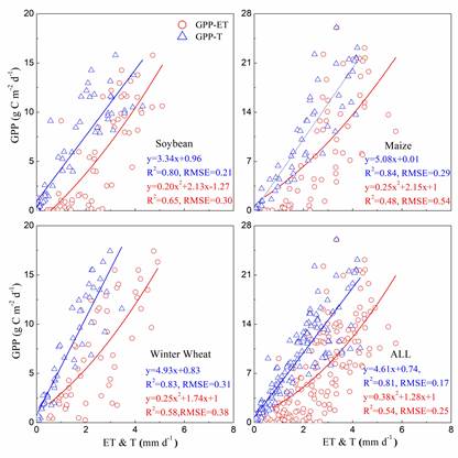 本研究基于全球通量观测网络FLUXNET,收集了主要粮食作物(玉米、大豆和冬小麦)的碳、水通量观测数据。在利用MODIS NDVI数据提取农作物生长季的基础上,实现了农田生态系统蒸散发的分解(图1)。而后,分别构建基于植被蒸腾量的冠层水分利用效率(WUET)和基于蒸散发量的生态系统水分利用效率(WUEET)。研究结果表明WUEET呈现出明显的季节动态,在作物生长期内主要呈单峰结构;而WUET则在生长季主要呈平台期,基本保持不变,说明作为内在水分利用效率的表征,WUET主要与作物类型有关(图2)。研究还发现在整个生长季中,所有站点的GPP和T呈现出较强的线性正相关,而GPP和ET则存在显著的非线性关系(图3)。多年多站点数据表明,在不区分作物类型的情况下,多年平均的WUEET约为WUET的一半(2.2 g C kg-1 H2O vs 5.0 g C kg-1 H2O),C4作物(玉米)的WUET和WUEET均略高于C3作物(图4)。相关研究有助于深入认识农田生态系统作物耗水规律。