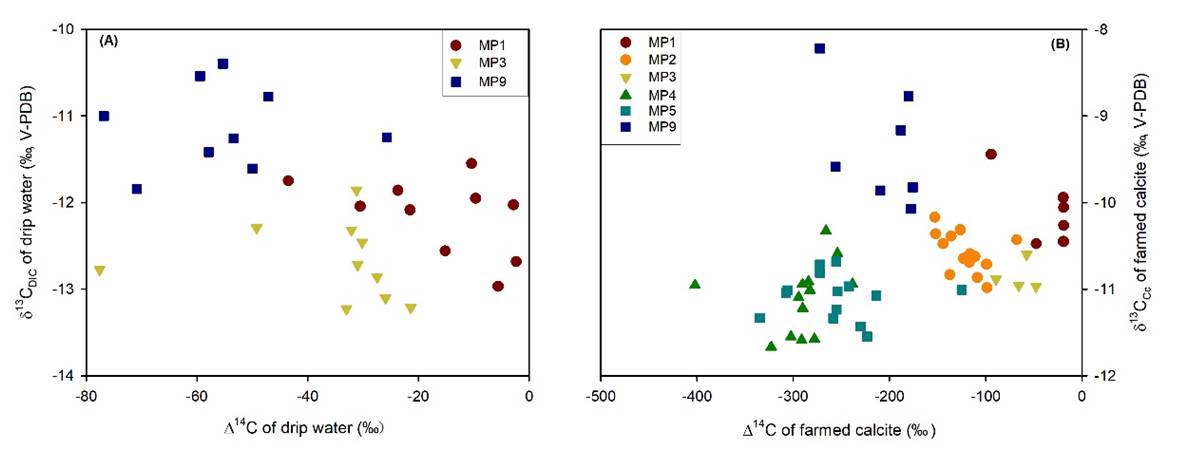 图3 芙蓉洞滴水δ13CDIC和Δ14C (A),洞穴次生碳酸钙沉积物δ13CCc和Δ14C (B)的分布