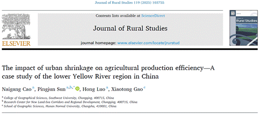 近日,孙平军教授课题组在地理学领域TOP期刊Journal of Rural Studies发表了题为“The impact of urban shrinkage on agricultural production efficiency—A case study of the lower Yellow River region in China”的研究成果(图1)。城市收缩作为全球性现象引发学术界的广泛关注,但收缩“词性”及其效应为正为负的“底层逻辑”尚具争议。农业生产效率作为城乡动态和区域系统重构的重要指标,为深入解城市收缩正负效应属性及其生成逻辑提供了新的切入视角。该文据此围绕城市收缩对农业生产效率的影响展开了探讨。