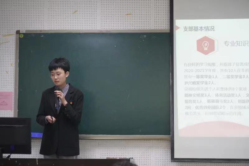 伴随着激昂向上的旋律与掷地有声的誓言,在场的青年团员共同坚定为共产主义事业而奋斗的思想信念。随后主持人向与会人员详细介绍五四红旗团支部评选标准以及分数细则,由参选团支部团支书上台逐一进行展示答辩,而由于教学实践而缺席本次会议的团支部则通过视频直播进行远程展示。