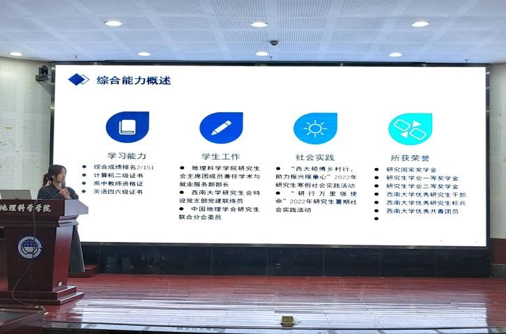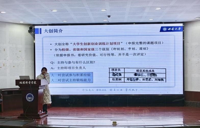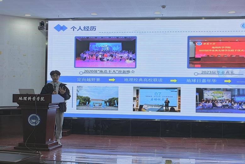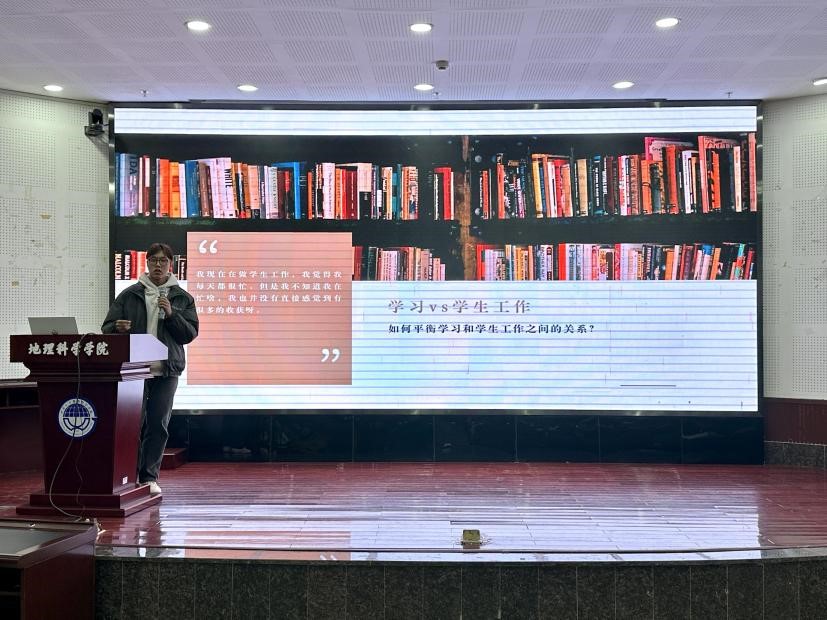 2021级人文地理学专业硕士研究生李雨晴对研究生阶段的学术科研进行了分享,她向大家传授了如何确定一个好的研究选题经验,她认为需要关注四个点:一是关注现有研究尚未涉及或较少涉及的部分;二是关注目前研究领域仍存在争议的部分;三是关注多学科角度的交叉领域;四是关注老话题的新方法和理论。2022级地图学与地理信息系统专业博士研究生肖尧以《乘风破浪的研究生》为主题,向同学展示了博士生的日常科研学习生活,以及应该怎样去培养自己的科研能力。她强调做学术离不开耐心和坚持四字,需要有扎实的理论基础、细致的观察力以及独立思考的能力,同时她也指出博士生涯并不是全部都是枯燥无味的,也充满了挑战和乐趣,同学们如果以后想要走学术道路,应该早做准备。