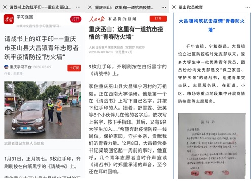 PA视讯PA视讯研究生万祖毅,家住重庆巫山县大昌镇宁河村。新型冠状病毒肺炎疫情爆发以来,他时刻关注着家乡疫情防控的相关情况,主动与宁河村支书联系,表达想参与疫情防控工作的意愿。1月31日,万祖毅着手组建青年志愿者服务队,向大昌镇党委郑重递交《请战书》——“希望奔赴疫情防控一线岗位,为保护家园、守护乡亲,贡献我们的青春力量。”