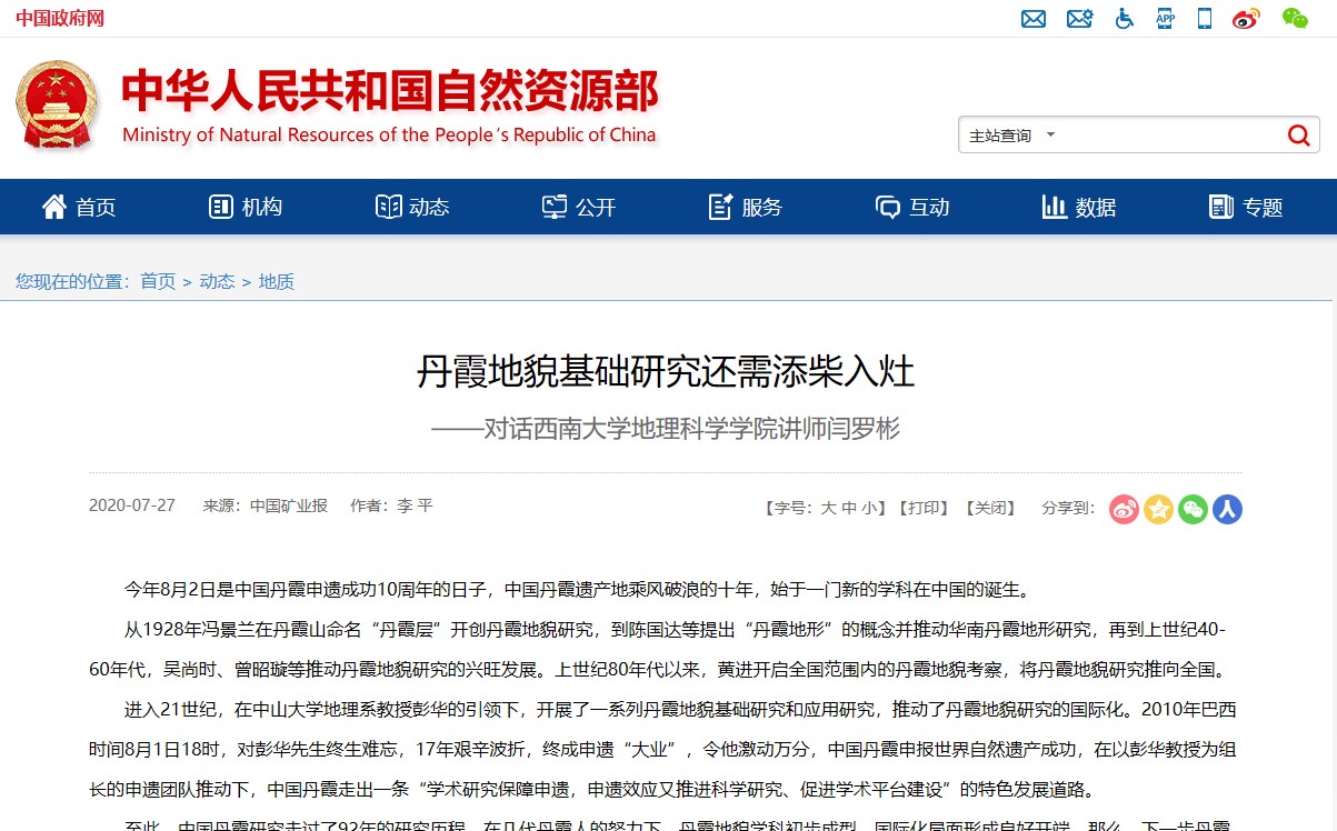 近日,PA视讯青年教师闫罗彬接受媒体《中国矿业报》记者李平专访,作为丹霞地貌领域较有影响力的学者,闫罗彬就丹霞地貌学科发展历程、学科前景、丹霞地貌地学价值和科普工作以及基础研究现状等方面做了介绍和展望。该专访以《丹霞地貌基础研究还需添柴入灶——对话PA视讯PA视讯讲师闫罗彬》为题,于7月26日在《中国矿业报》和新华网客户端发表,一经上线即获得广泛关注,在新华网首日浏览量超过100万,获得良好社会评价。昨日该专访被自然资源部官网转载(http://www.mnr.gov.cn/dt/dzdc/202007/t20200727_2534555.html)。