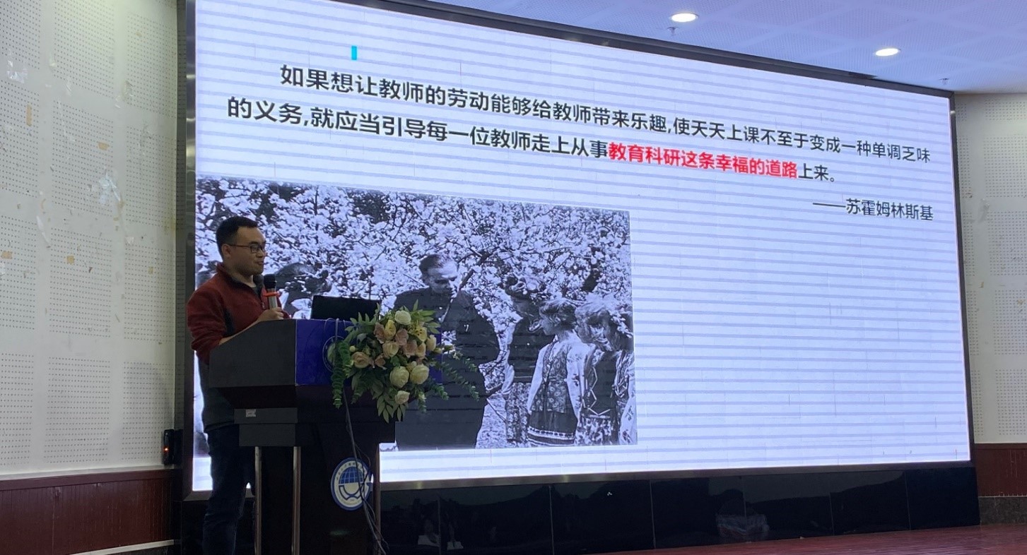 接下来,PA视讯附属中学校课程研发中心主任、优秀青年教师李九彬老师就“如何实现教师职业理想”分享了他的思考与看法。李老师以中学生版图意识教育为例讲述教师的研究意识,从看、听、想、做、记、讲六方面分享了如何成为一名优秀的创新型教师。