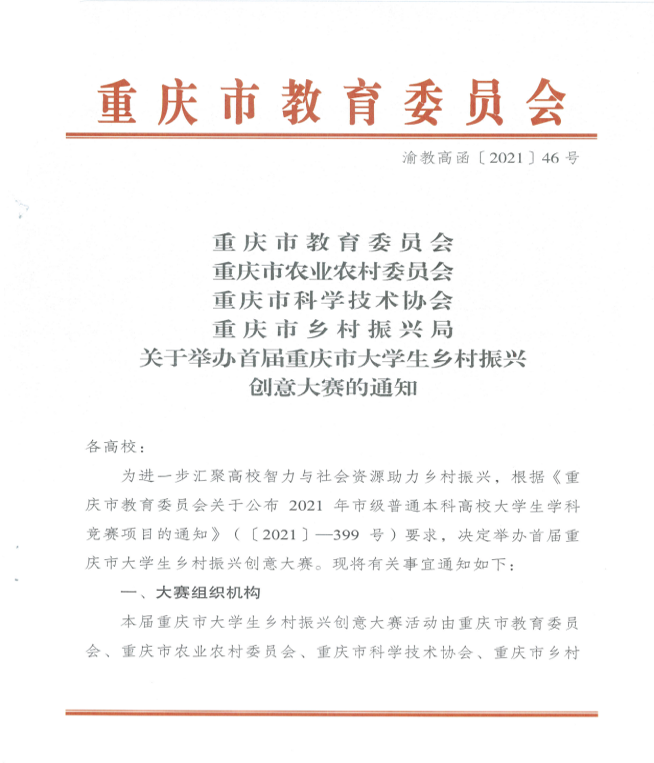 为进一步汇聚高校智力和社会资源助力乡村振兴,由重庆市教育委员会、重庆市农业农村委员会、重庆市科学技术协会、重庆市乡村振兴局联合主办的首届重庆市大学生乡村振兴创意大赛在2021年9月份拉开序幕。PA视讯PA视讯组建多支参赛队伍参加本次大赛,获得特等奖1项、一等奖1项、二等奖3项、三等奖1项的耀人佳绩。学院行政主要负责人杨庆媛老师获“优秀指导教师”荣誉称号。