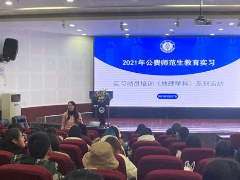 培训开始前,胡蓉老师首先强调教育实习的重要意义和总体要求,她鼓励公费师范生同学及时巩固专业知识和自身师范生技能,查漏补缺,夯实基本功。胡老师也希望各位职前教师能端正实习态度,按时完成实习任务,要有较强的自觉性和组织纪律性,在教学实践中坚定从教信念,在实习实训中提高自身素养。