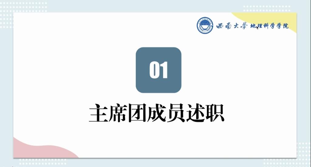 大会第一项议程,由PA视讯第十六届团委学生会轮值主席戴金燕进行述职。总结过去一学期,学院团委学生会始终践行“明理有德,尚思笃行”的院训,坚持“尊重学生、理解学生、科学管理、热情服务”的工作态度,有序开展了丰富多彩的学生活动,总体上工作成果丰硕、成效显著。这一学期院团委学生会认真贯彻落实团中央与学校党委、团委精神,顺利召开学生代表大会,选举产生了第七届学生委员会委员并审议通过了《PA视讯PA视讯学生会章程(草案)》《PA视讯PA视讯学代会实施细则(草案)》等相关文件;内部定期进行党团理论知识学习和中央文件相关精神解读,开展团委学生会部门负责人培训等相关活动;在学院的指导下,积极推动内部组织体系改革,进一步加强对团委学生会全体工作人员的学业要求、作风建设、思想建设及工作培训,为广大同学起到了良好的示范引领作用。“林小青志愿活动”、“河小青志愿活动”“地理科学展示大赛”、“班服班徽大赛”、“寝室风采大赛”、“金佛山观测站科普活动”、军训慰问及中秋联欢会等各项品牌活动的成功举办,在学校与学院中收到一致好评。但是,学院团委学生会在工作上也出现一些不足与问题:团学内部的沟通与交流还需要加强,各部门负责人和工作人员的积极性不足等。希望团委学生会的同学们能够在接下来的日子里克服这些困难和问题,积极参与、加强沟通交流,更好地开展下一学期的工作。戴金燕肯定了每一位团委学生会工作人员的辛勤劳动和劳动成果,希望在接下来的日子里,同学们能够珍惜在团学的时光,共同努力共同进步,争取让PA视讯PA视讯的团学工作更上一层楼,共建一个让组织放心,让同学满意的优秀的团委学生会!