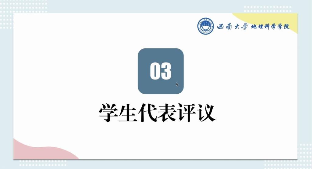 大会第三项议程,由学生代表评议。来自2020级人文地理与城乡规划专业的同学就本次述职发表了自己的感想。该同学表示,虽然自己没有加入团委学生会,但在一年半的时间内,深刻体会到了团委学生会是一个具有团结性、组织性且独具特色的团队,在每个学期都会举办丰富多彩的活动,为学院和同学尽心服务,最后真挚地表达对团委学生会工作人员辛勤付出的感谢。