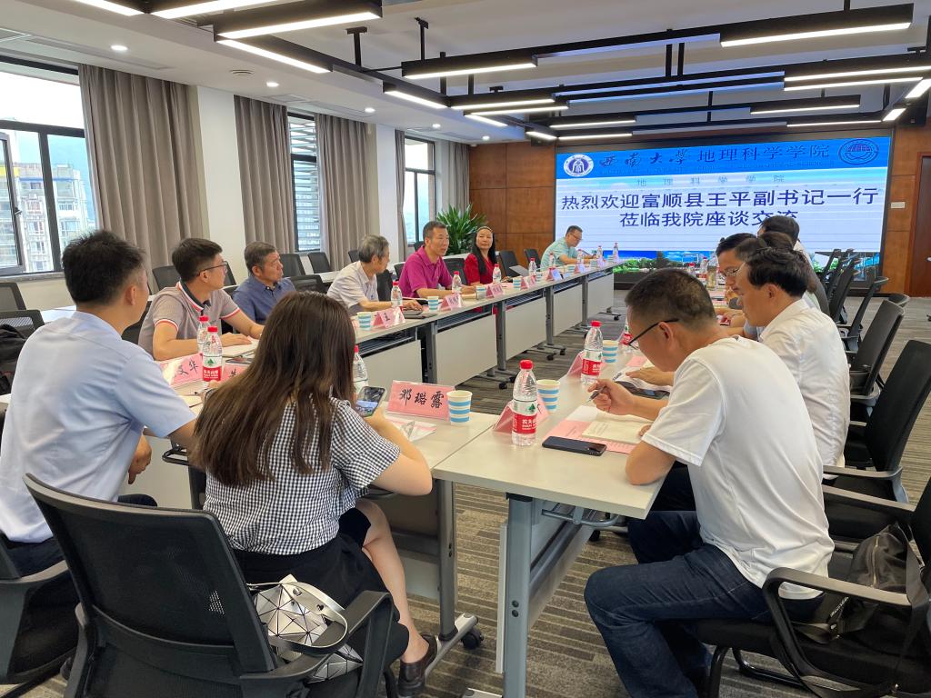 6月16日上午,富顺县委副书记、县总工会主席王平同志带领县农业农村局、代寺镇相关领导及工作人员应邀莅临我院座谈交流,浙江新湖集团执行总裁、总建筑师卢翔先生,重庆师大地理与旅游学院前院长、中国旅游研究院长江旅游研究基地首席专家罗兹柏教授,学院党政领导,教职工代表及相关工作人员参加会议,会议由学院党委主要负责人主持。