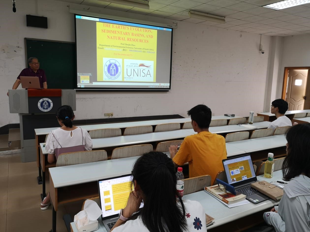 7月11日-7月22日,受学院教学分管副院长邀请,南非大学地质系赵宝金(Prof. Baojin Zhao)教授莅临我院为本科生讲授国际课程《地球的演化、沉积盆地与自然资源》,在常态化疫情防控情况下,本门课程采取了线上线下相结合的授课方式,选课总人数达90人。