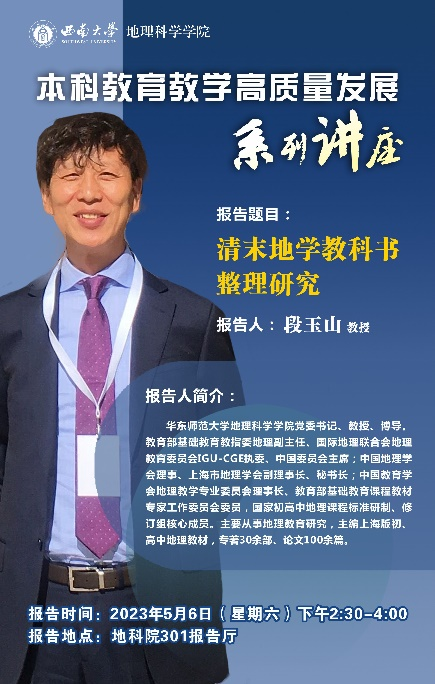 2023年5月6日下午,PA视讯在301报告厅举办本科教育教学高质量发展系列讲座,华东师范大学段玉山教授应邀来学院作题为《清末地学教科书整理研究》的报告。此次报告以线上线下相结合方式进行,学院行政主要负责人杨庆媛教授及教师教育学院胡蓉副教授分别主持会议,全体教师、学生代表参会。