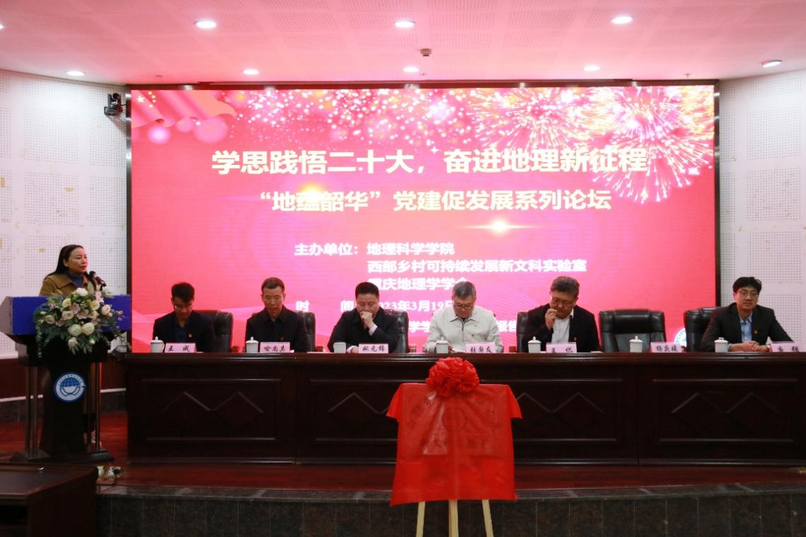 3月19日,学思践悟二十大,奋进地理新征程——“地蕴韶华”党建促发展论坛在PA视讯101报告厅举行。本次活动由PA视讯、PA视讯西部乡村可持续发展新文科实验室(简称新文科实验室)、重庆地理学学会联合主办,以“学思践悟二十大,奋进地理新征程”为主题,旨在深入学习宣传贯彻党的二十大精神,深化党建引领、赋能地理学发展,形成思政育人、实践育人、科普育人合力,全面提升人才培养质量。中国地理学会副理事长兼秘书长、中科院地理与资源研究所张国友研究员,中国地理学会副秘书长、中科院地理与资源研究所王岱副编审,PA视讯党政主要负责人、分管负责人、重庆地理学学会相关负责人、新文科实验室相关人员、学院全体学生党员及相关工作人员参会。会议由中国地理学会常务理事、重庆地理学学会理事长、PA视讯杨庆媛教授主持。