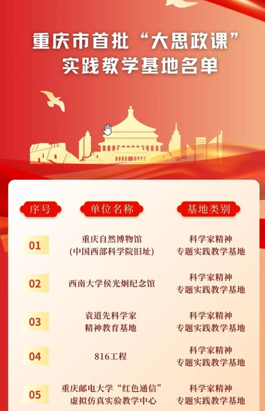 为深入贯彻落实习近平总书记关于“大思政课”建设的重要指示批示精神,推进重庆市“大思政课”实践教学基地建设,加快构建“大思政课”工作格局,根据教育部办公厅等八部门《关于公布“大思政课”实践教学基地名单的通知》(教社科厅函[2022]31号)和重庆市教育委员会等十二部门《关于印发〈重庆市全面推进“大思政课”建设重点举措〉的通知》(渝教宣发[2023]1号)相关要求, 2024年3月14日,重庆市教委会同市委宣传部、市科技局等十部门公布首批50家“大思政课”实践教学基地(渝教宣发[2024]2号)名单,袁道先科学家精神教育基地成为首批重庆市“大思政课”实践教学基地之一!