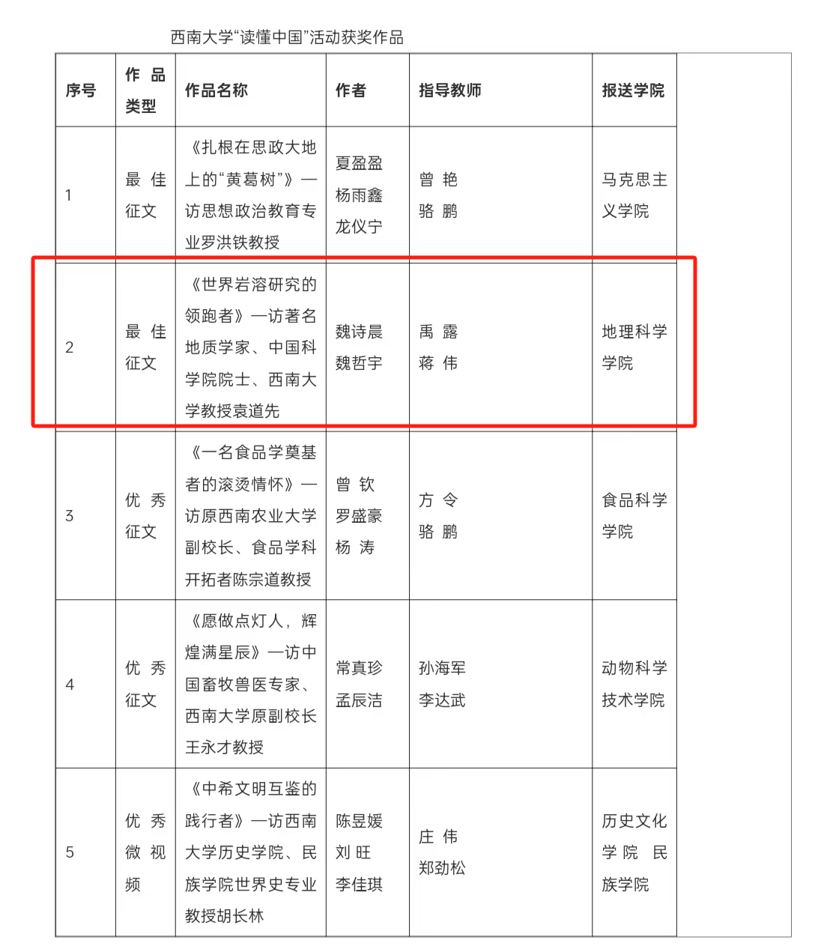 本次活动以“教育强国 奋斗有我”为主题,活动期间,全国近千所高校积极参加,12万余名大学生访谈优秀“五老”2.69万名,报送征文642篇,微视频377个,舞台剧50个。自2024年5月份启动以来,学院积极参与学校召开的工作总结表彰暨部署会、作品创作培训暨推进会、作品修改专家点评会等,最终报送征文《世界岩溶领域领跑者》参加全国比赛。