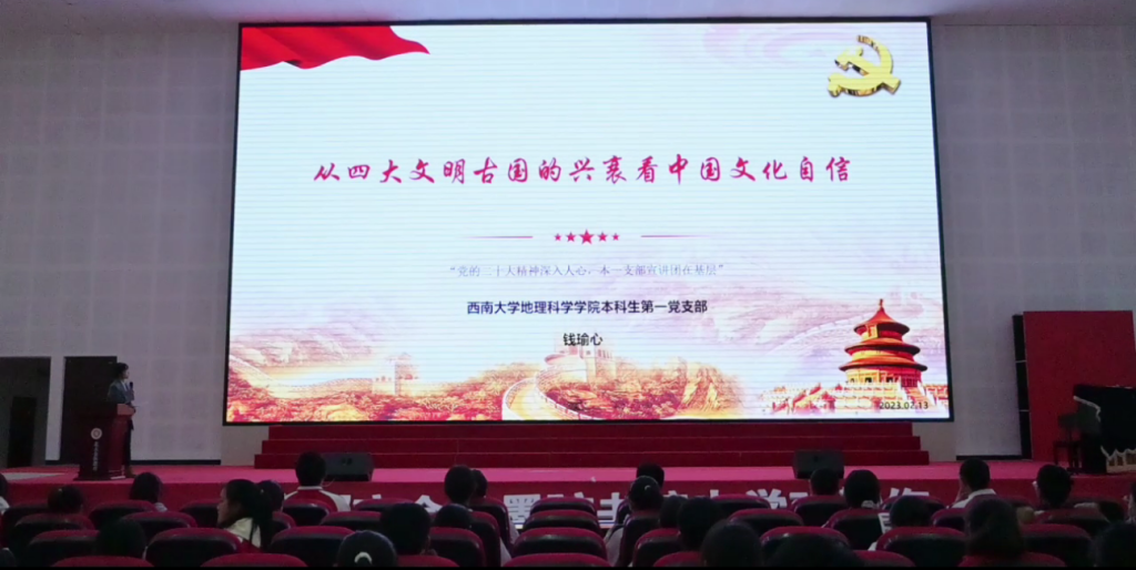 春节过后,迎来了各地学校开学的日子,北极星志愿服务队的学生党员任秋帆、钱瑜心、刘嘉慧走进校园,为当地中小学生们带来了一堂特别的“开学第一课”。2月16日,钱瑜心来到大理市金秋墨弦书院中学开展了“学习二十大精神 铸牢中华民族共同体意识”主题团课活动。通过介绍四大文明古国历史发展演变,带领学生们沉浸式体验和理解中国文化,增强文化自信。课堂上,钱瑜心以丰富的史料和生动的案例向共青团员展示了中华文明的博大精深和中华民族的“根”和“魂”,不断提升团员们的价值认同。