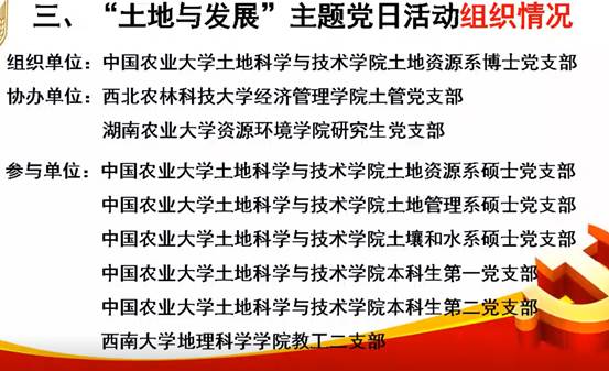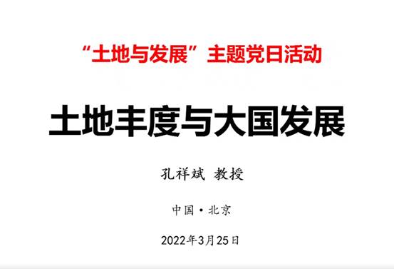 为深入学习贯彻习近平总书记关于教育、“三农”工作和乡村振兴战略的重要论述以及2022年中央一号文件精神,中国农业大学土地科学与技术学院土地资源系博士党支部开展主题党日活动,邀请中国农业大学孔祥斌教授主讲“土地丰度与大国发展”,结合当前俄乌冲突 ,透过土地丰度的视角来谈大国的粮食安全与发展,以及粮食安全与发展对促进中华民族崛起的重要意义。此次活动由中国农业大学土地科学与技术学院土地资源系博士党支部主办,西北农林科技大学经济管理学院土管党支部、湖南农业大学资源环境学院研究生党支部协办。该活动吸引全国土地资源管理、土地科学等相关专业学生党支部近100个,参会人数超过1400人。