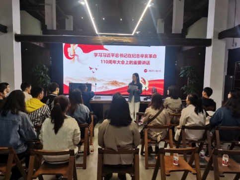 学生党员卢铭沁、谢传峰、冯馨莹带领大家一起学习习近平总书记在纪念辛亥革命110周年大会上的讲话,讲话回顾总结了中国共产党继承孙中山先生革命事业、团结带领人民不懈奋斗的光辉历程,深刻阐述了辛亥革命110年来的历史启示,并启示我们在新时代下应做爱党爱国、甘于奉献青春智慧的新青年;应做拼搏进取,勇于担当发展重任的新青年;应做引领新风,善于开拓创新的新青年。
