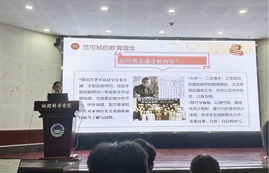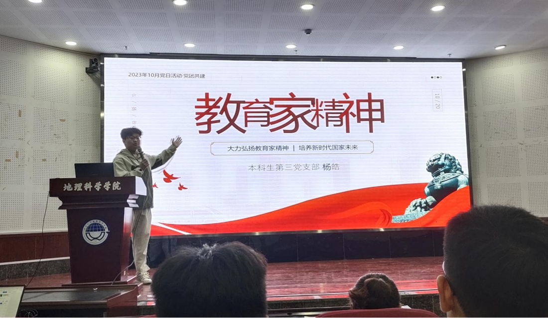 在第二部分“学习优秀地理教育家思想”的学习中,由本科生第二党支部汪禹杉同志、本科生第三党支部杨皓同志分别讲述竺可桢院士和李吉均院士的教育家精神。汪禹杉同志着重讲述了竺可桢院士作为高校地理教师,为培养以天下为己任的领袖人才和新中国科学教育事业的骨干力量而做出的卓越贡献。杨皓同志着重讲述了李吉均院士在地理实践、学科研究与育人方面的教育家精神,提到做人做事要求真,为真理而奋斗。