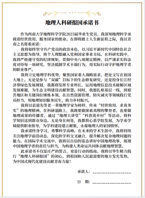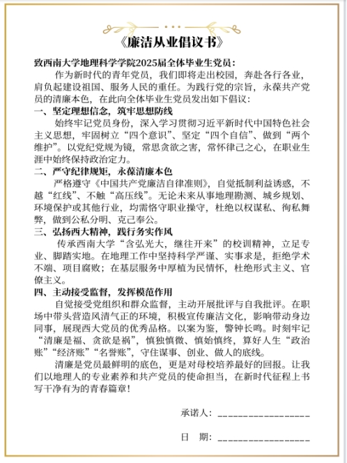 姚元锦为毕业生党员讲授专题党课,进一步树牢毕业生党员的纪律意识、规矩意识和底线意识,涵养严谨正派的行为作风。在庄严的党旗下,全体党员重温入党誓词,铿锵誓言传递出对党的忠诚和为共产主义事业奋斗终身的坚定决心。毕业生党员代表领读《地理人科研报国承诺书》《廉洁从业倡议书》,立下“把论文写在祖国大地,让廉洁融入职业血脉”的誓言,将理论学习成果转化为行动自觉。