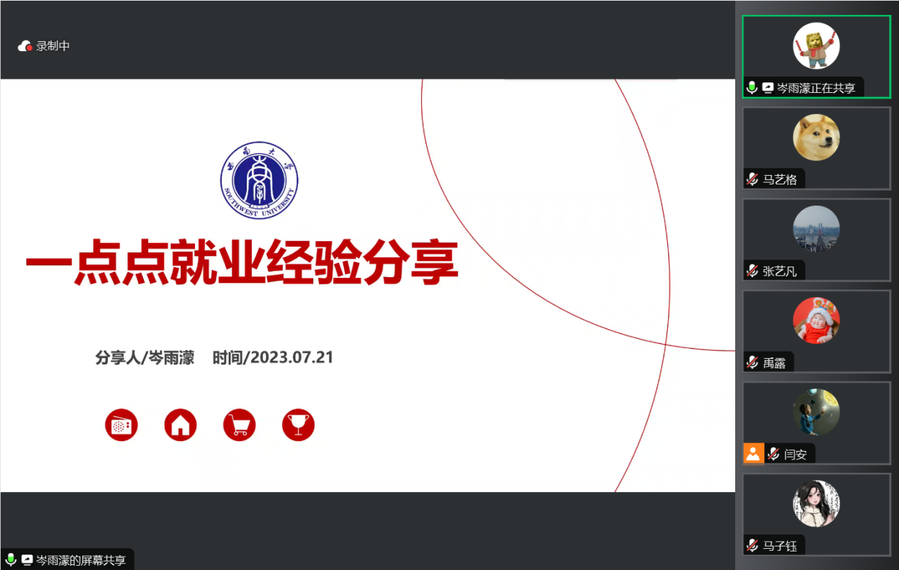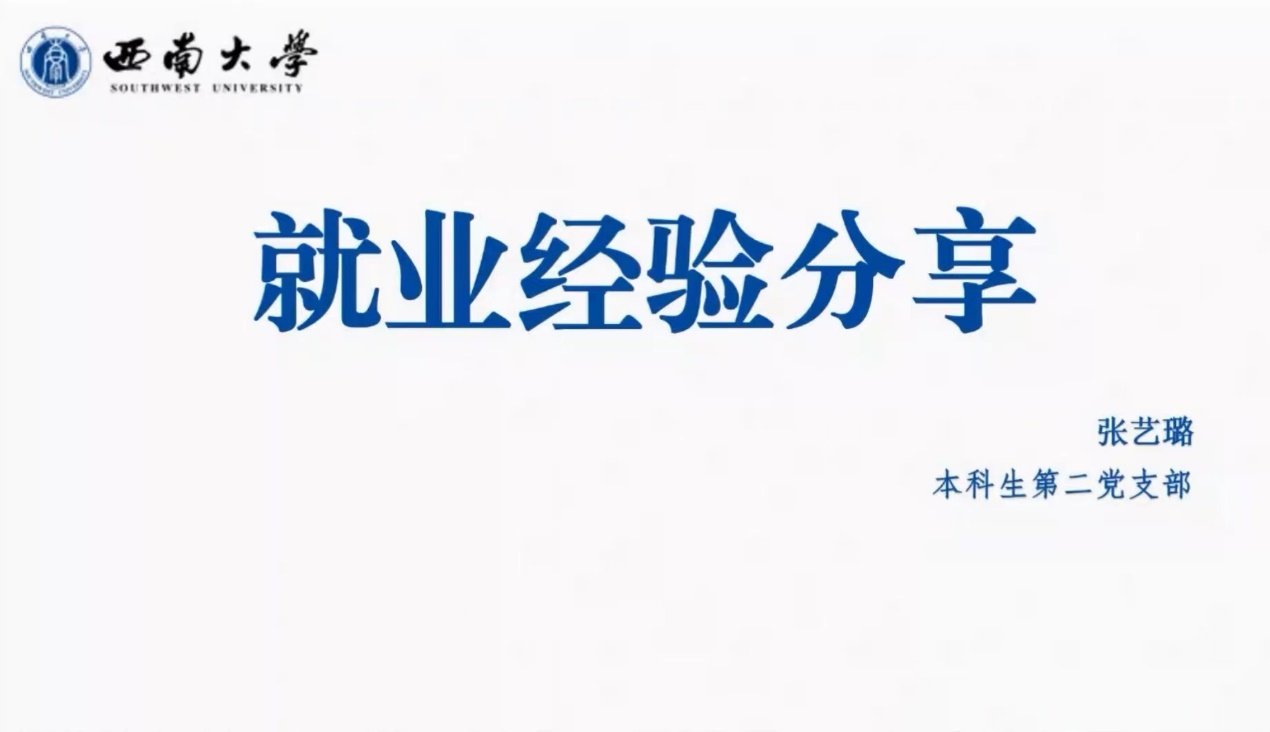 随后,来自2019级的四位优秀师范生党员为参会的低年级同学分享了求职经验。张艺璐从招聘信息获取、应聘流程一览、签约注意事项三个方面进行介绍,她谈到简历的投递要突出自身个性,不应在内容上贪多;郭锐着重提出要做好就业规划,强调就业选择前的信息检索能力,并且分享了他的个人说课经验;马子钰谈到要做好专业知识积累、片段课训练与高考题练习等一系列准备,强调就业要放平心态;岑雨濛则分享了她在重庆本地的求职经验,并详细分析了部分学校的招聘条件。